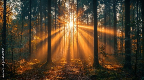 © fourtakig, Fototapeta premium Serene autumn glow radiant sunlight through enchanted forest trees
