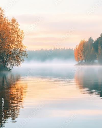 © Pattypatt, Fototapeta premium Serene autumn lake with misty reflections.