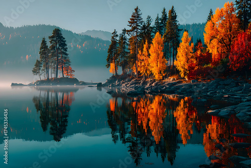 Naklejka premium Serene Autumn Lakeside Scenery with Vibrant Foliage and Reflections -...