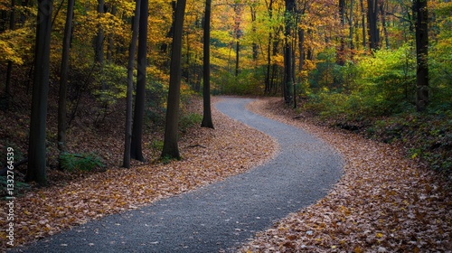 © Maria, Naklejka premium serene autumn landscape featuring winding trail through vibrant fall foliage crisp leaves covering pathway gently swaying