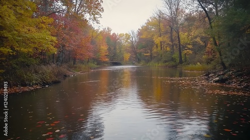 Fototapeta premium Serene autumn landscape, peaceful river reflecting vibrant fall foliage,...