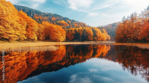 Fototapeta premium Serene Autumn Landscape Reflected in Tranquil Lake