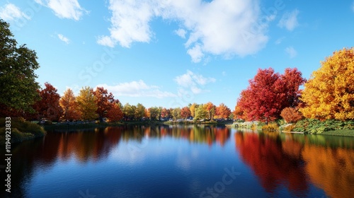 © deon, Fototapeta premium Serene autumn landscape reflecting vibrant foliage on calm water.
