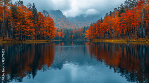 © Just1, Naklejka premium Serene autumn landscape with colorful trees reflecting in the calm waters of an isolated lake, surrounded by a dense forest and mountains