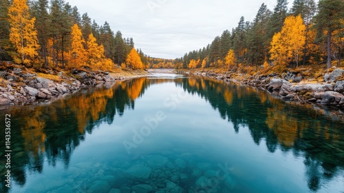 Fototapeta premium Serene Autumn Landscape with Reflection in Calm Water and Trees