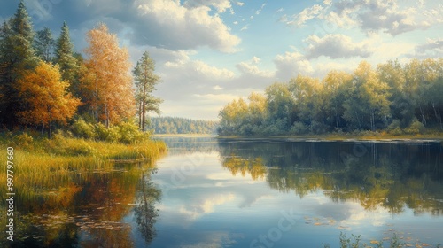 Fototapeta premium Serene Autumn Landscape with Reflections on Water