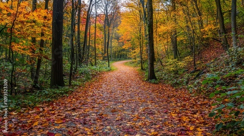 © Tuachan, Obraz premium Serene Autumn Landscape with Vibrant Foliage and Peaceful Pathway Through Trees in a Colorful Forest During Fall Season Captured in Natural Light