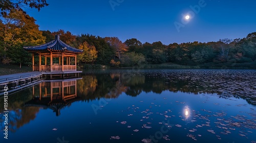 Fototapeta premium Serene Autumn Moonlit Gazebo Over Still Water