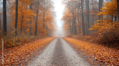 Obraz premium Serene autumn pathway through misty forest a tranquil journey amidst vibrant...