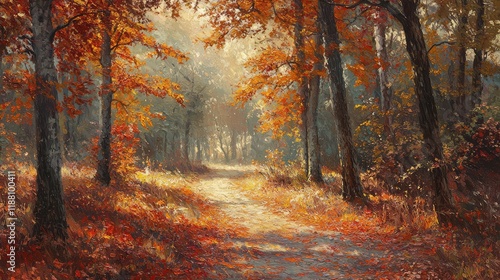Obraz premium Serene Autumn Pathway Through Vibrant Forest with Golden Leaves