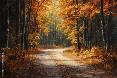 Obraz premium Serene autumn pathway through vibrant trees, inviting exploration and...