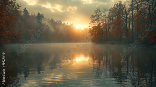 Fototapeta premium Serene Autumn Reflection on a Misty Lake at Sunrise