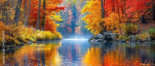 Naklejka premium Serene Autumn Reflections: Colorful Trees with Vibrant Foliage Mirrored in a...