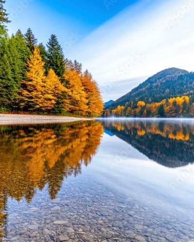 Fototapeta premium Serene Autumn Reflections on Calm Lake Surrounded by Colorful Trees
