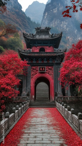 © nurman, Obraz premium Serene autumn scene featuring a traditional Chinese red gate and bridge, surrounded by vibrant red maple leaves against a dramatic mountain backdrop.