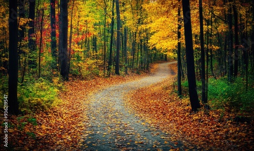 Obraz premium Serene autumn scene, forest, winding path, vibrant foliage