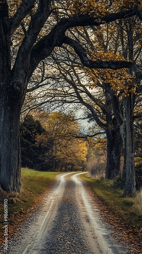 © atar, Obraz premium Serene Autumnal Forest Road with Winding Pathway and Sunlight