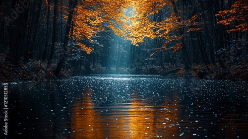 Naklejka premium Serene autumnal forest scene with a calm river reflecting golden leaves and...