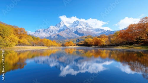 © Giman, Fototapeta premium Serene autumnal mountain lake reflecting a snow-capped peak