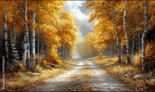 © Supriyati Pixxel, Obraz premium Serene autumnal path through golden birch forest. Sunlight filters through leaves