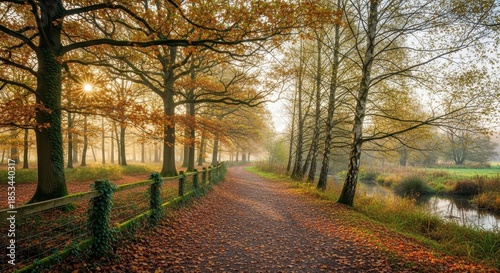 © Rumput, Obraz premium Serene autumnal pathway lined with trees and vibrant golden foliage under warm sunlight