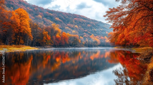 Naklejka premium Serene autumnal river scene with vibrant foliage reflecting in calm water