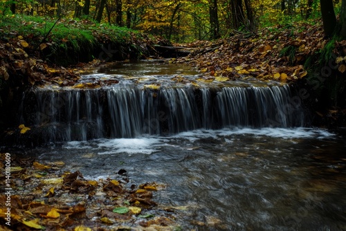 Fototapeta premium Serene autumnal stream cascading over small rocks, surrounded by fallen...