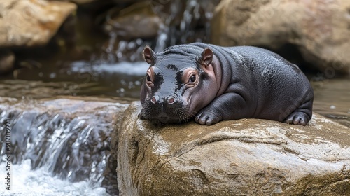 © Jakkarin, Fototapeta premium Serene Baby Pygmy Hippo Lounging on Rock by Ocean Waves