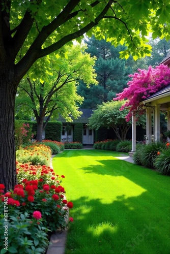 © Sunisa, Obraz premium Serene backyard oasis featuring lush green lawn, vibrant flowerbeds, and mature trees providing ample shade Perfect for relaxation and outdoor enjoyment , plants, botany
