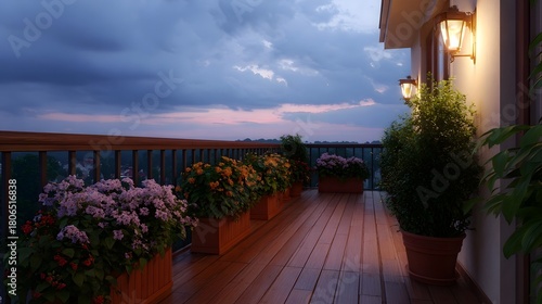 Naklejka premium Serene balcony view at dusk featuring colorful potted flowers wooden deck and...