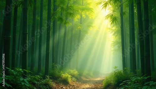 Naklejka premium Serene bamboo forest bathed in morning sunlight, mist clinging to the leaves...