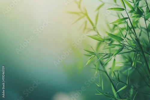 Fototapeta premium Serene Bamboo Forest Lush Green Leaves and Soft Sunlight on a Blurred Gradient Background.
