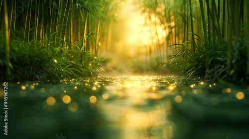 © Harry, Fototapeta premium Serene Bamboo Forest on the lake with Sparkling Light
