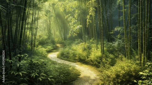 © Cornflakesei, Obraz premium Serene Bamboo Forest Path with Sun Rays