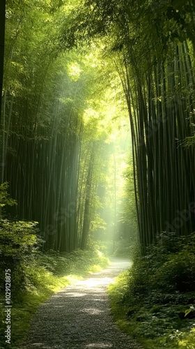 Obraz premium Serene Bamboo Forest Pathway Illuminated by Sunlight Beams Creating a Tranquil Green Escape for Nature Enthusiasts