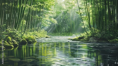 © Imsuniyah, Obraz premium Serene Bamboo Forest River