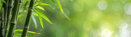 © Thamonchanok, Obraz premium Serene bamboo forest scene with lush green bamboo stalks and leaves, creating a peaceful and tranquil ambiance, perfect for relaxation themes.
