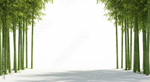 Obraz premium Serene bamboo grove path softly lit by sunlight creates peaceful zen aesthetic. AI Generated