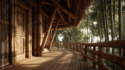 Fototapeta premium Serene Bamboo House Exterior with Wooden Deck and Lush Green Surroundings
