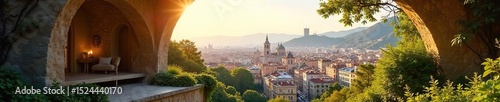 Fototapeta premium Serene Barcelona cityscape viewed from a secluded sanctuary, sunlight...