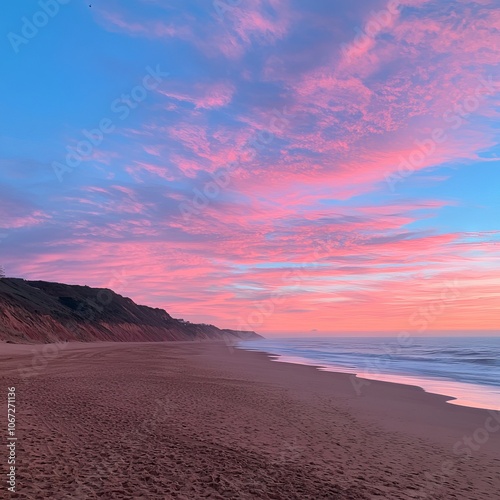 © MetaKibo, Naklejka premium Serene beach at sunset with vibrant pink and blue sky reflections.