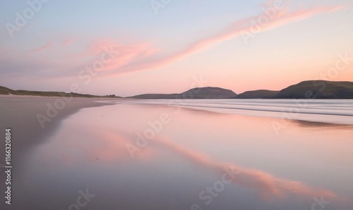 Fototapeta premium Serene beach landscape at sunset with soft reflections.