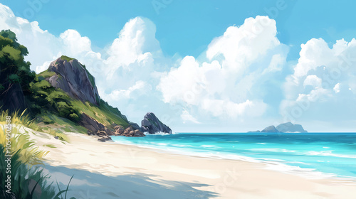 © coach, Fototapeta premium Serene Beach Landscape with Clear Blue Sea and Sky
