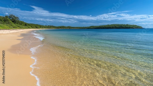Obraz premium Serene beach landscape with clear water, golden sand, and lush greenery under...