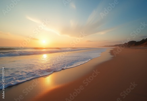 © Aleks, Fototapeta premium Serene beach scene at sunset with gentle waves rolling onto the shore and golden light reflecting off the sand and water creating a peaceful atmosphere