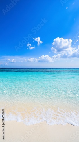 Fototapeta premium Serene Beach Scene: Azure Waters, Fluffy Clouds, and Soft Sand