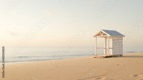 Obraz premium Serene beach scene featuring a small wooden structure standing alone on the sand under a soft, ethereal light
