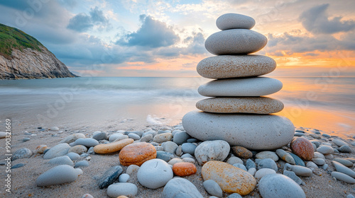 Fototapeta premium serene beach scene featuring smooth rocks meticulously stacked in balance,...