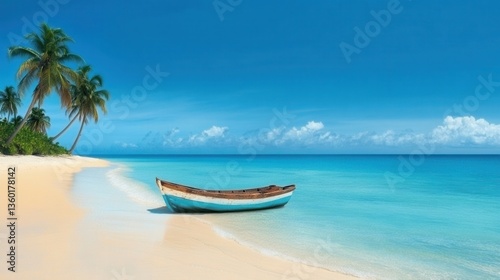 © Pakkarada, Obraz premium Serene beach scene with a boat and palm trees under a clear blue sky.