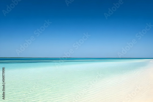 © mbah, Fototapeta premium Serene beach scene with clear turquoise water and a cloudless sky.